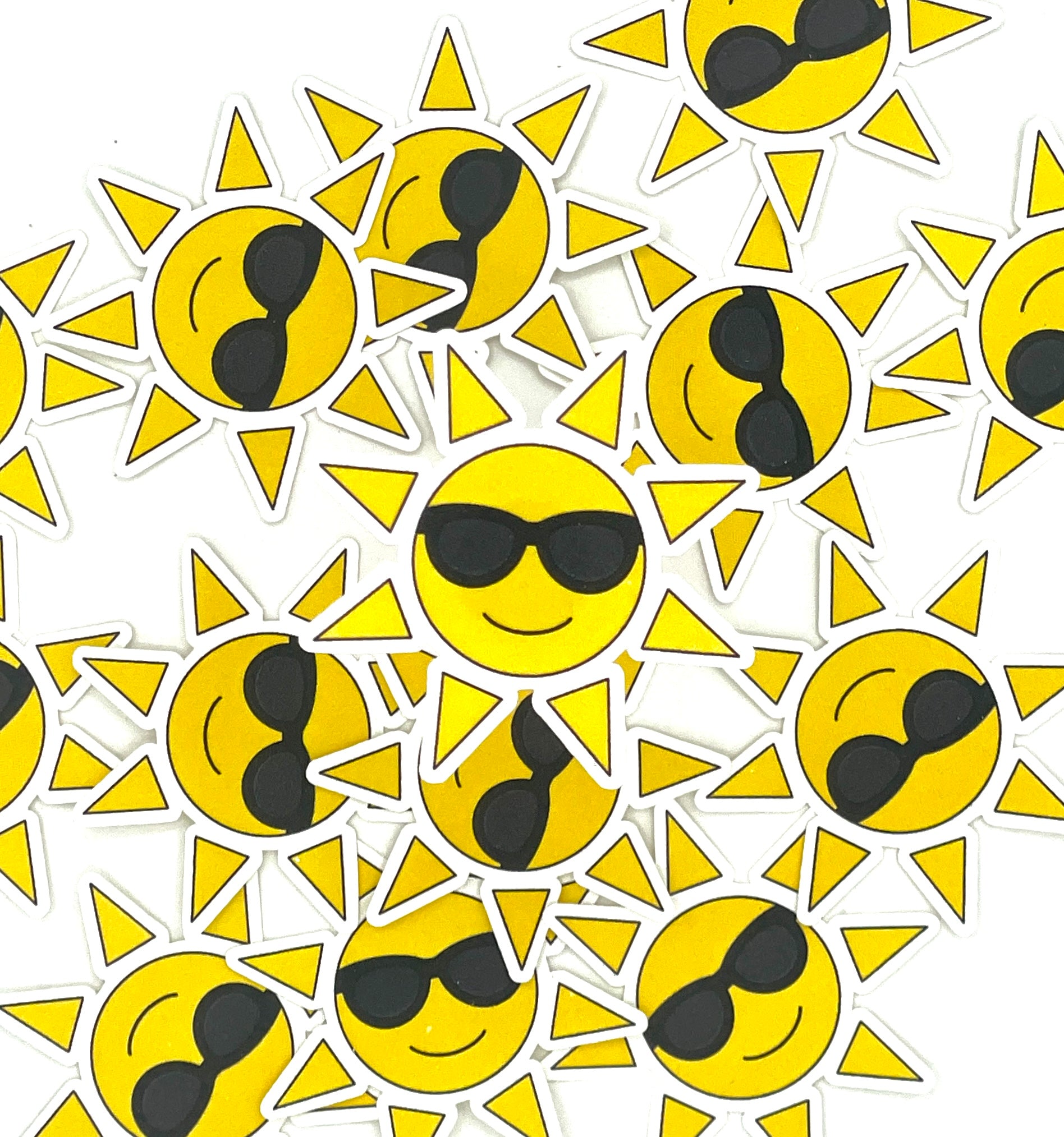 When the weather is getting warmer, stay cool with our sun wearing sunglasses sticker! Our stickers are fully weatherproof, and can be placed on any flat, clean, surface.